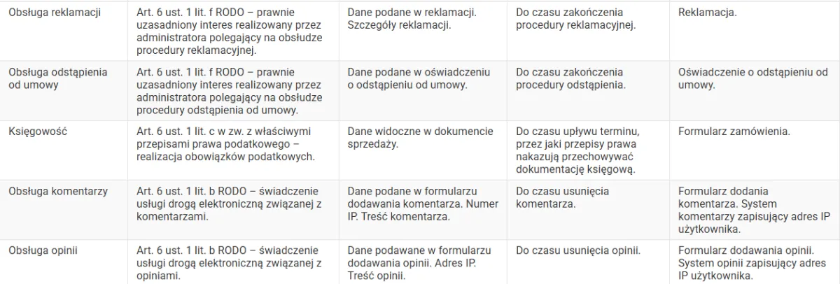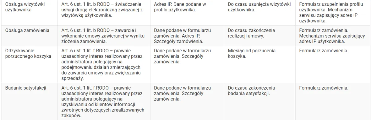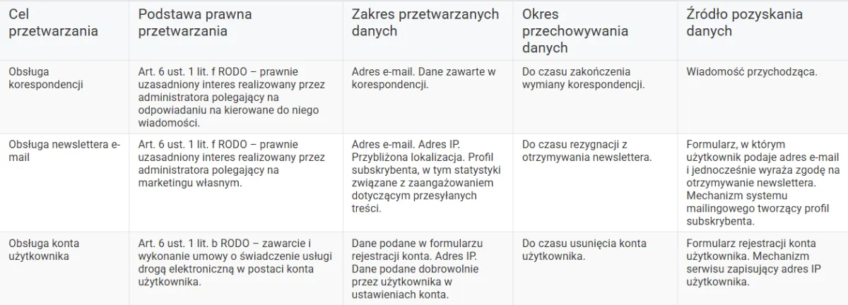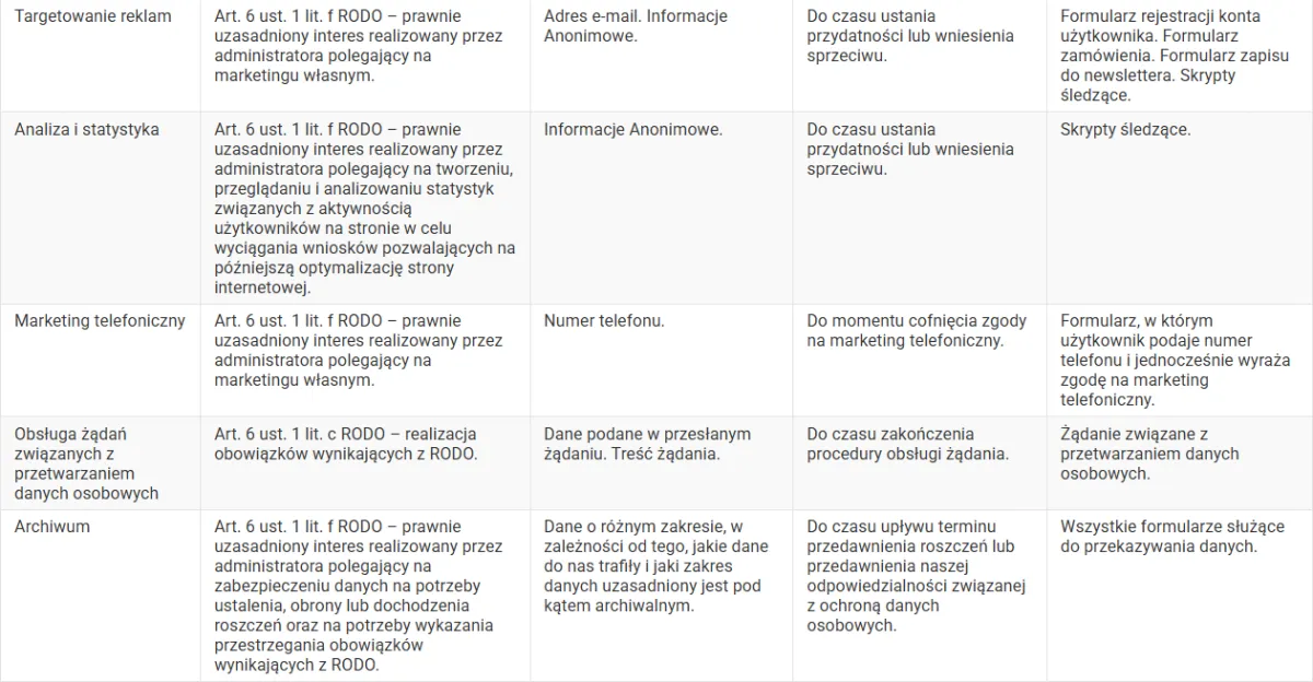 Twoje dane osobowe przechowujemy tak długo, jak to jest uzasadnione w ramach danego celu przetwarzania danych osobowych, w związku z czym okresy przetwarzania różnią się w zależności od celu - ich określenie znajdziesz w tabeli stanowiącej załącznik do polityki prywatności.